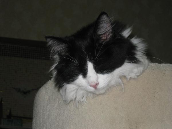 I think he is trying to outgrow the cat tree!! He often hangs out body parts when sitting in it now. His tail and butt were also hanging out, but I knew if I got up to take a pic on that side he would have woken up to investigate what I was doing!